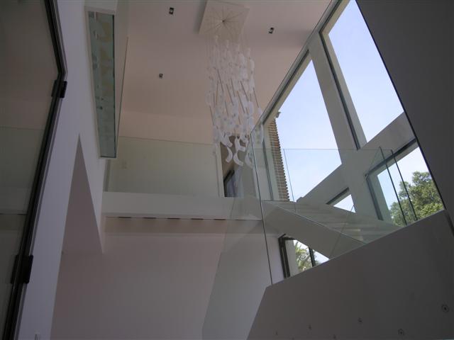 D'une tonalité blanche éclatante, cet escalieracier paré de garde-corps en verre feuilleté laisse baigner l'immense volée du soleil tropézien qui pénètre l'espace par de larges ouverturesvitrées.