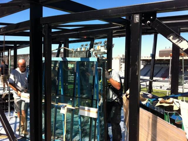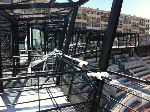 L'ossature métallique en quart de rond réalisée en porte-à-faux par la Société ACTI vient de se parer de ses menuiseries (nouvelle Gamme Série 65 de WICONA) dans les délais impartis puisque la dernière vis a été posée en date du 2 août dernier : mission accomplie sous l'oeil bienveillant de Gérard ATALE (responsable technique du RCT représentant le Maître d'Ouvrages).