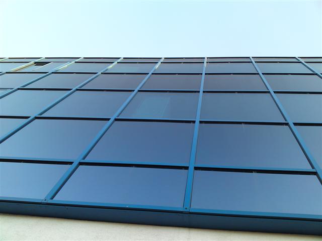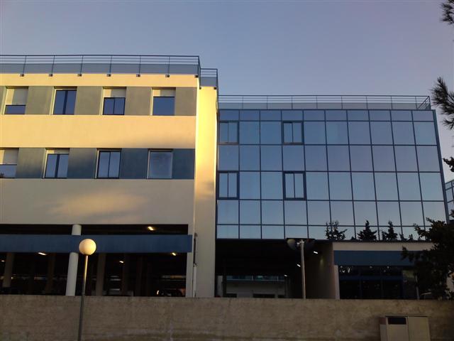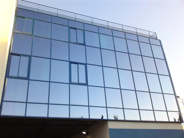 Réalisée avec des profilés aluminium bleus assortis aux verres double-vitrage (une face trempée bleutée et une face feuilletée), ce mur rideau reflète le ciel azuréen depuis l'extérieur et imprègne les lieux d'une ambiance rassurante, tout en filtrant la chaleur.