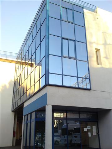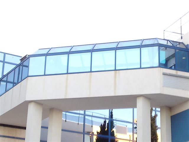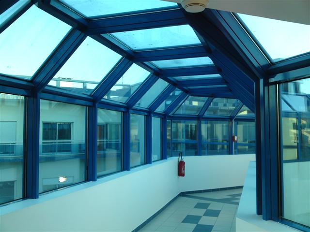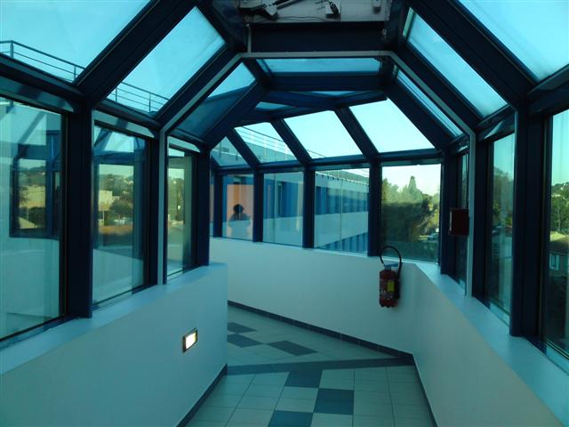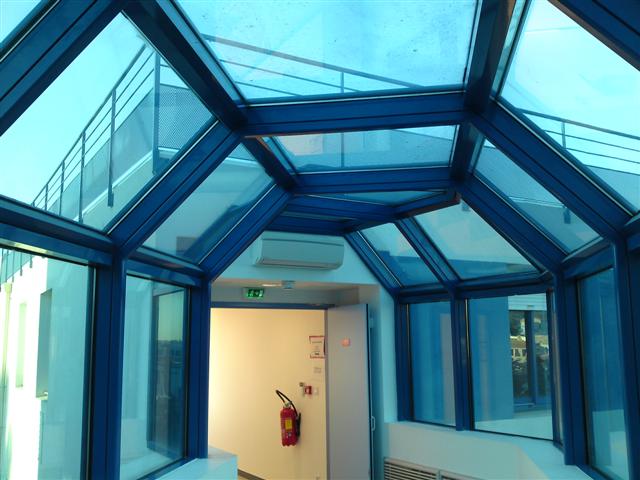 Une passerelle à 3 pans coupés couverte d'une verrière à 5 pans permet la jonction entre l'ancien et le nouveau corps de bâtiment. Elle est le fruit de la collaboration entre notre atelier acier (qui a assuré la réalisation de l'ossature) et notre atelier aluminium (qui a réalisé les châssis vitrés).