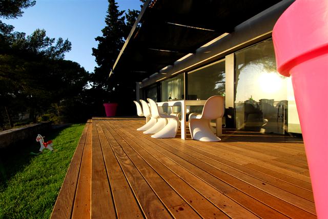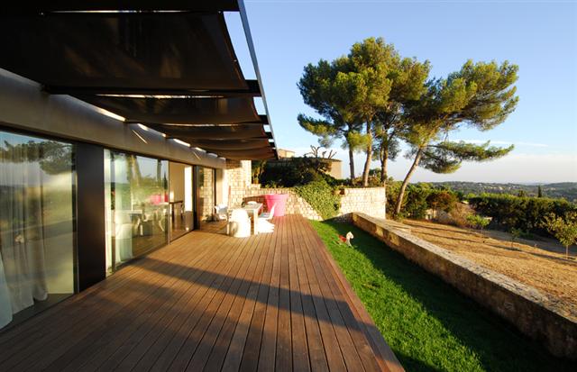 Maria Aluminium et Acier à créé et posé la façade vitrée. Celle-ci inclue des accès sur la terrasse en bois : plusieurs baies coulissantes en galandage venant se refouler sur les parties fixes ont été mises en place dans ce but.