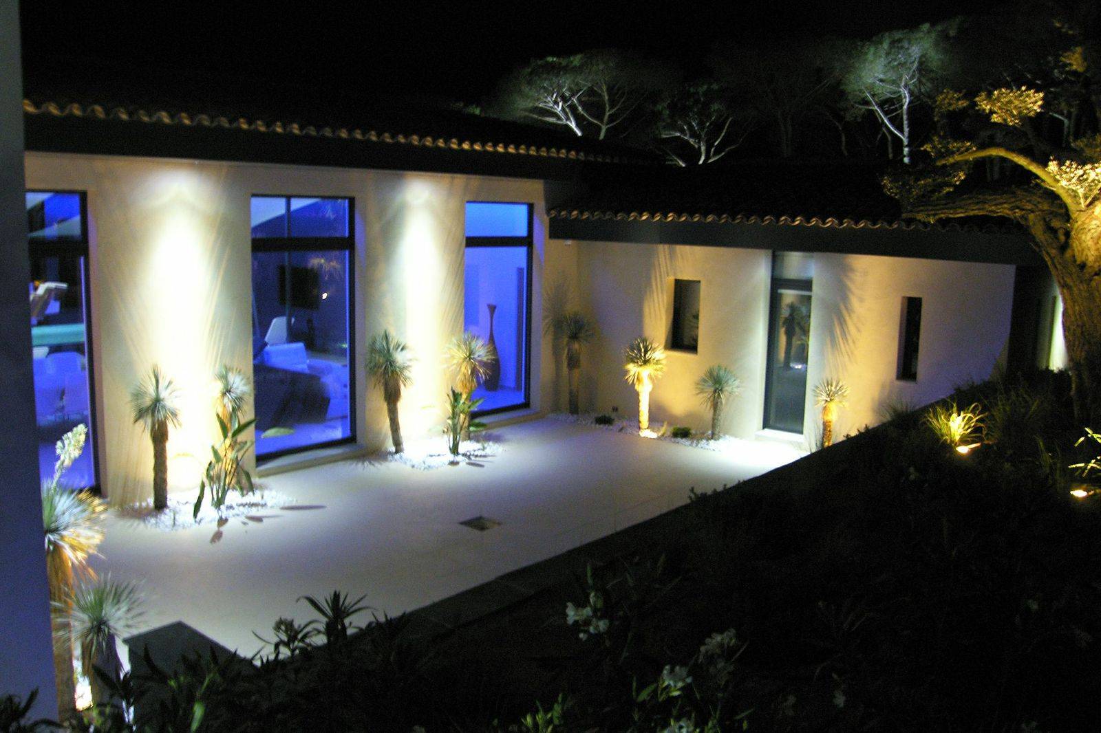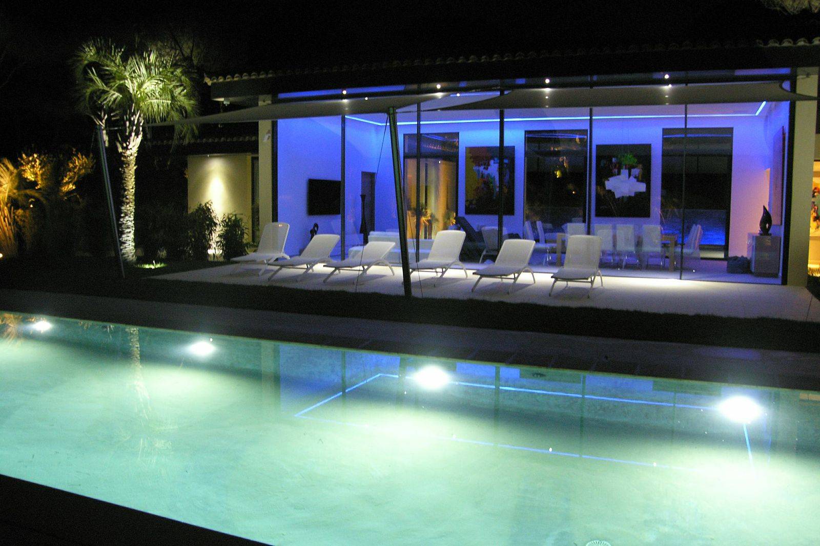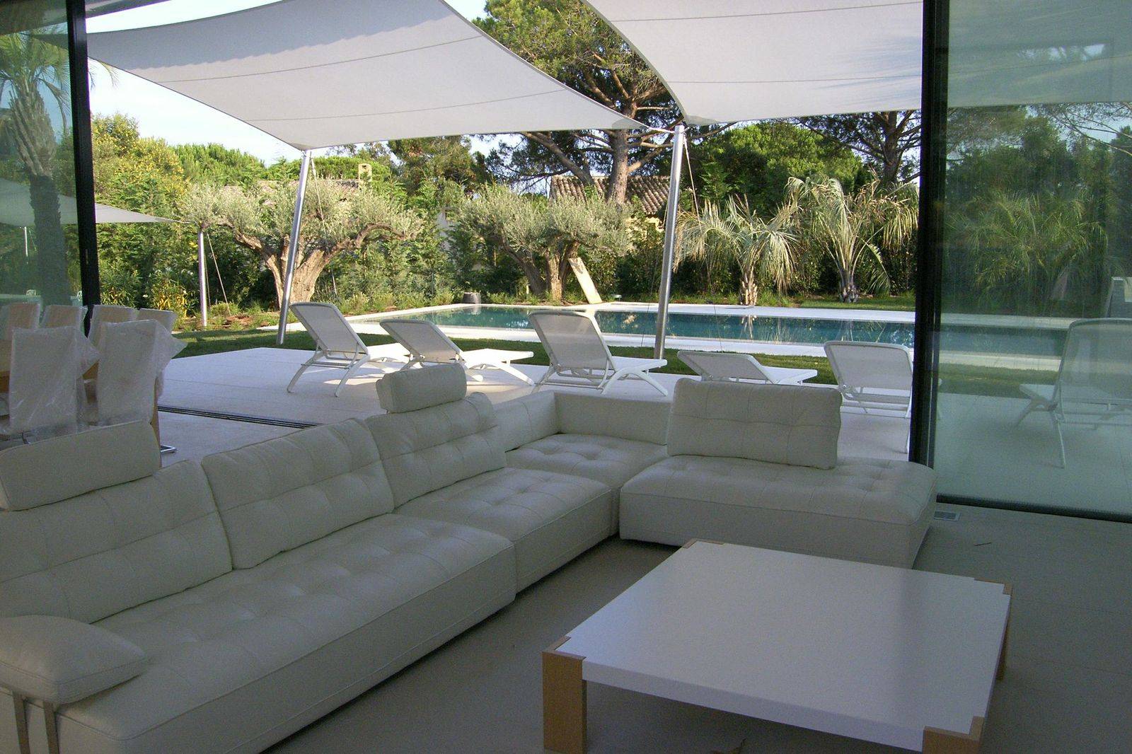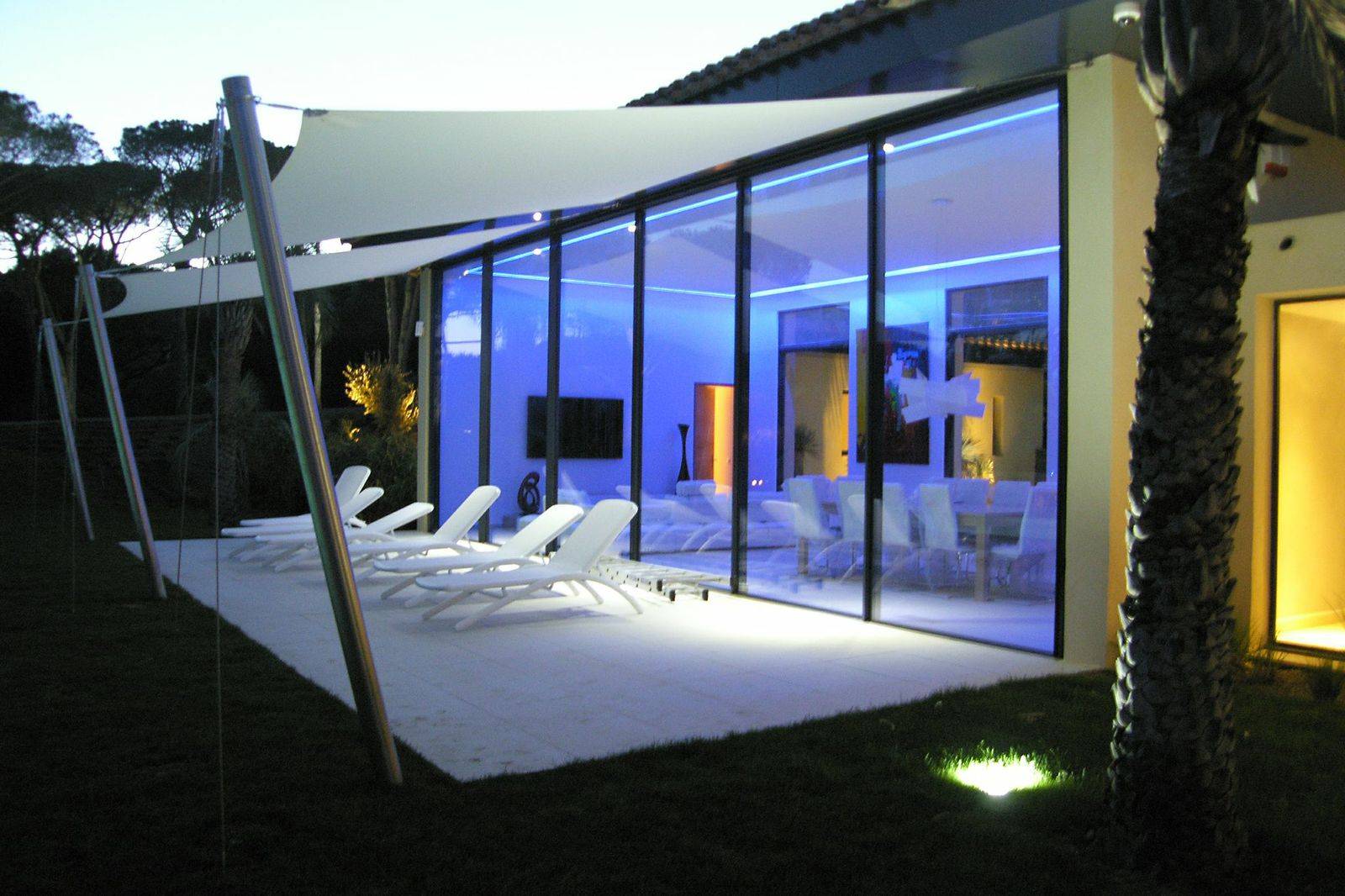 Cette villa de luxe réalisée en plusieurs corps de bâtiments se pare de grandes ouvertures qui laissent pénétrer une lumière généreuse, permettant d'accéder à un somptueux jardin aux essences méditerranéennes.