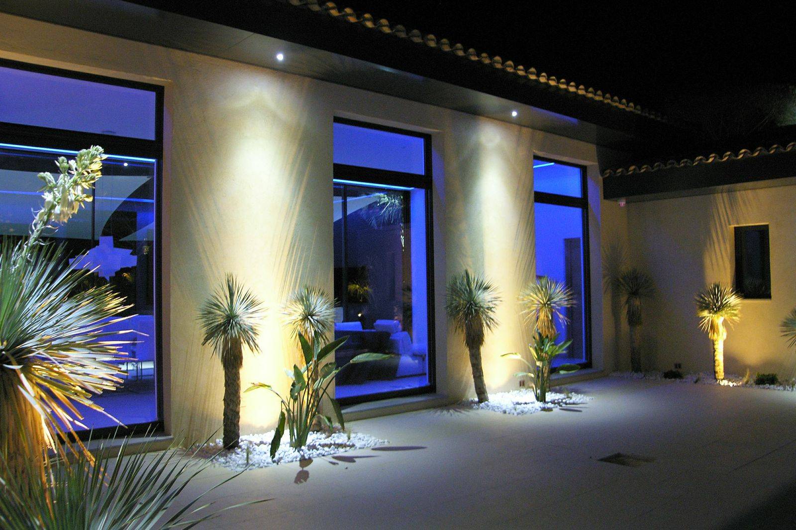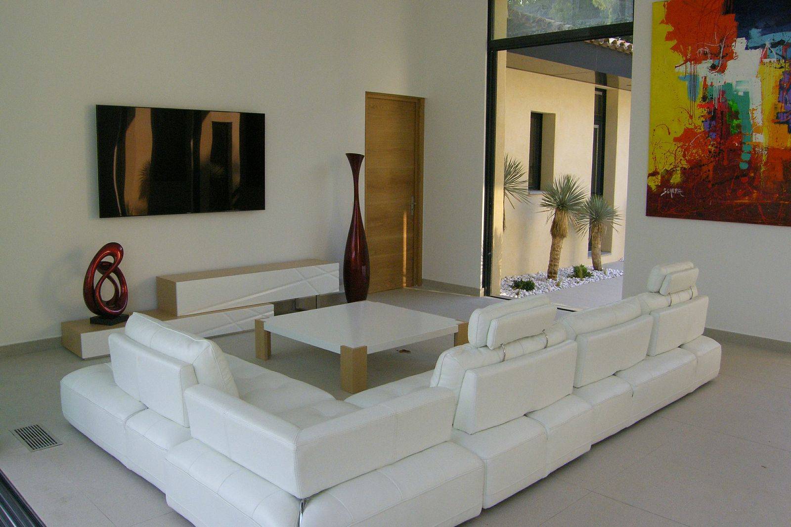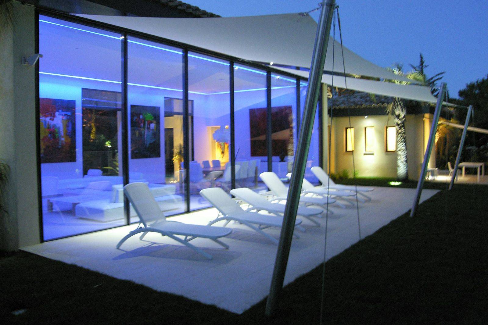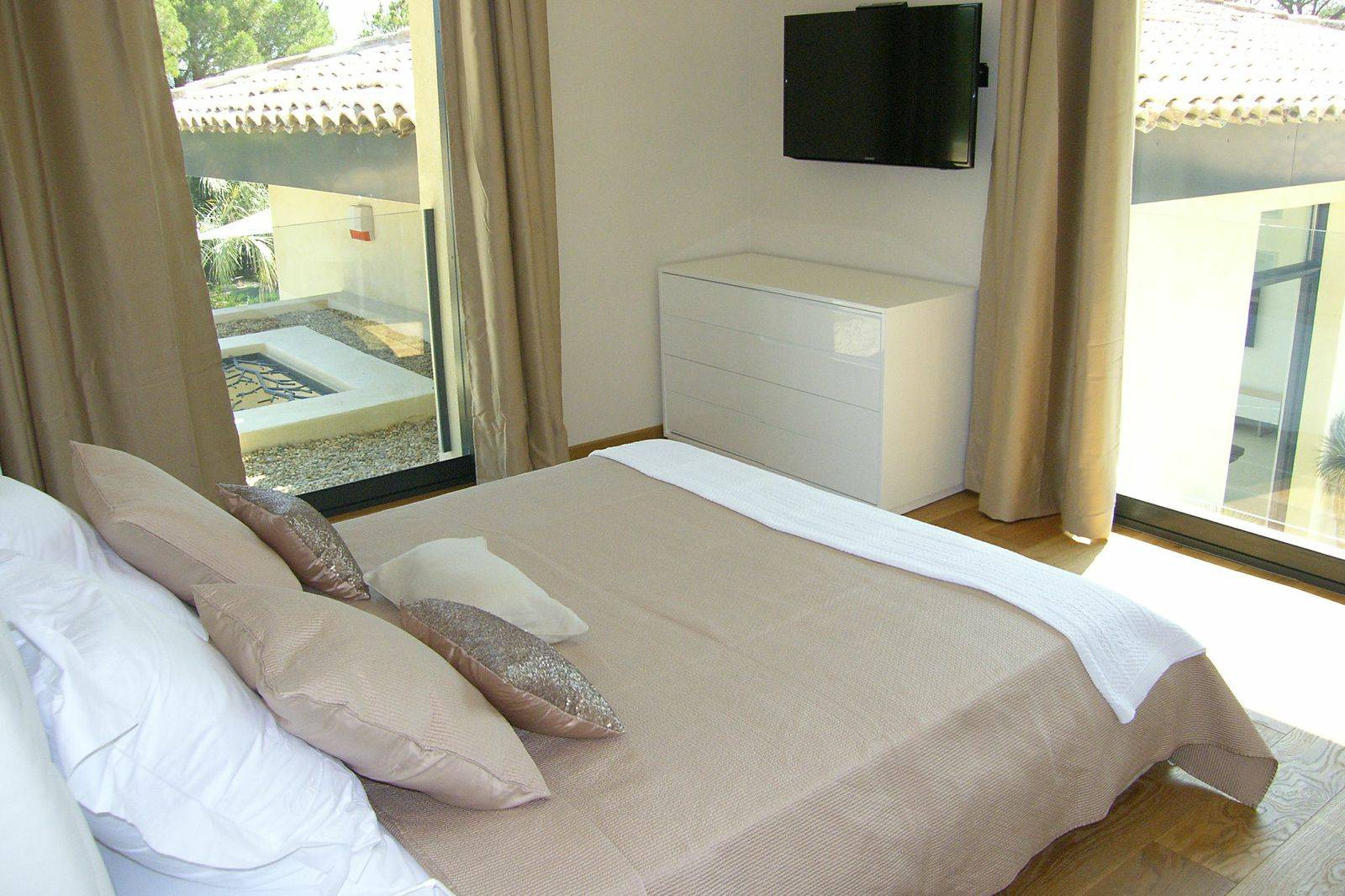 Cette villa de luxe réalisée en plusieurs corps de bâtiments se pare de grandes ouvertures qui laissent pénétrer une lumière généreuse, permettant d'accéder à un somptueux jardin aux essences méditerranéennes.