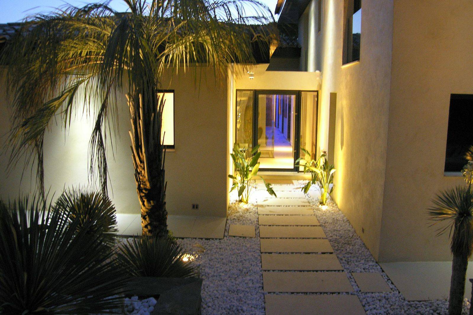 Un patio vitré ouvert sur le ciel azuréen trônant dans l'entrée et orné d'un immense cactus a été réalisé en verres collés.