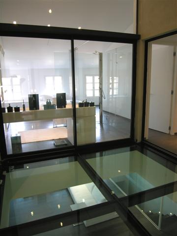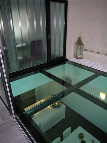 Cette dalle, réalisée dans des conditions d'accès difficiles d'approvisionnement des verres grutés par la toiture, permet un éclairage zénithal des parties inférieures de cette villa tropézienne.