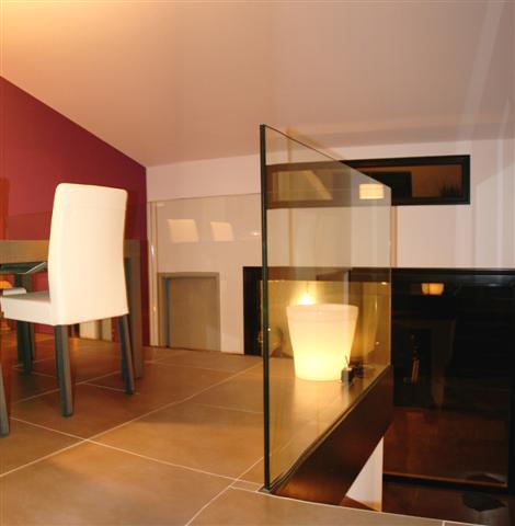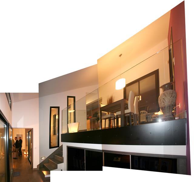 Des machoires acier viennent ici assurer la rigidité de garde-corps en verre réalisés avec des volumes STADIP feuilletés 88/2 avec joints polis sur les périmètres. Chaque volume est collé à la jonction.
